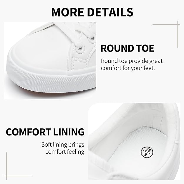 Womens white tennis shoes use PU leather upper,PU upper is water-resistant and easy to clean.PU leather sneakers have been thickened at the ankle to fit the foot more comfortably.