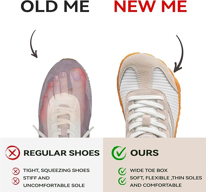 Women’s zero-drop sneakers with a wide toe box for barefoot-like comfortThe upper of barefoot shoes features suede leather patchwork design with fashionable elements.Casual yet stylish, minimalist design complements any outfit